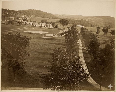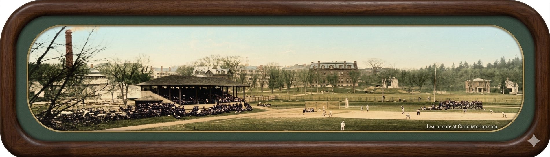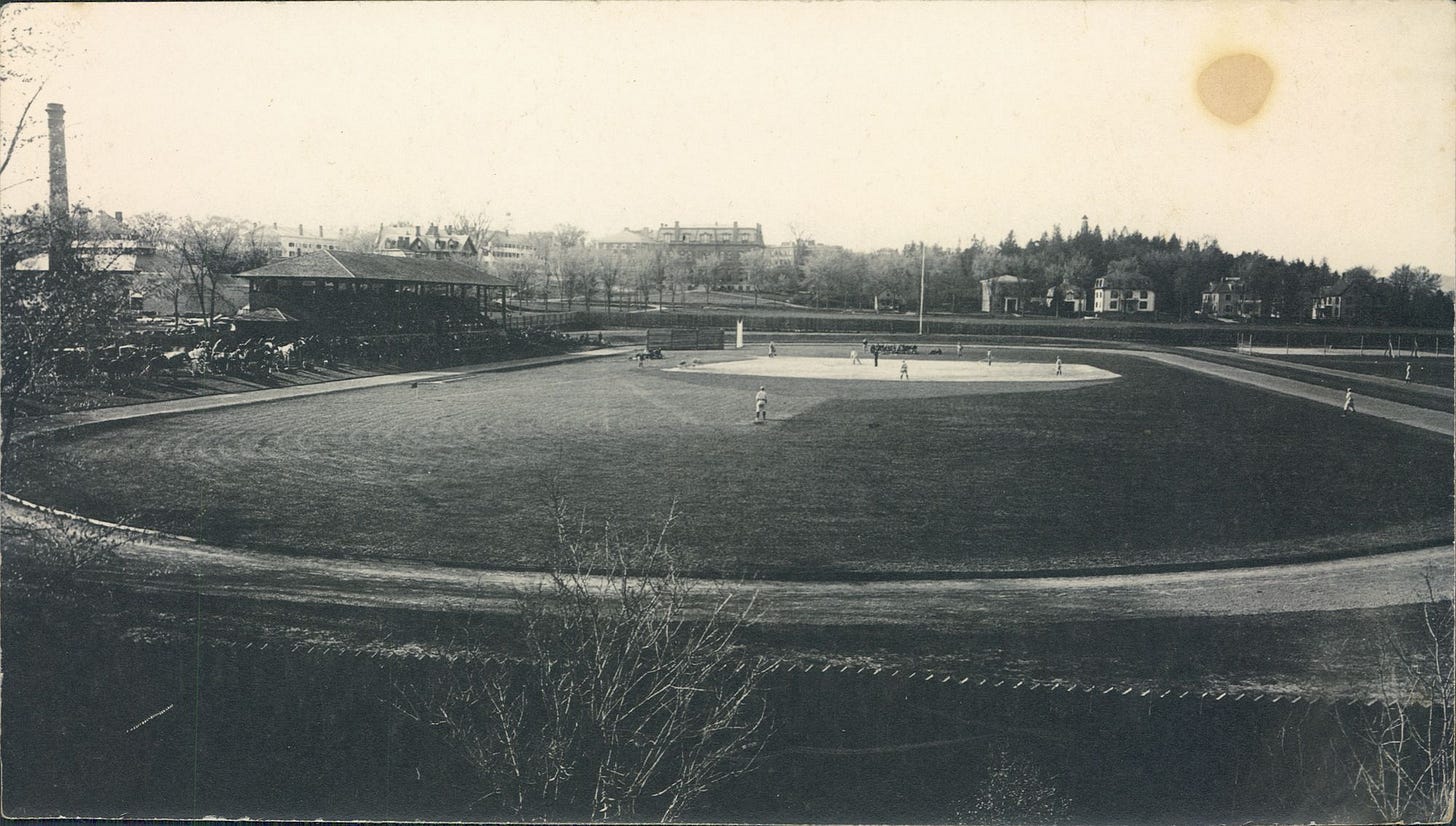 Crosby Street runs behind the grandstand, and the street beyond the flagpole is East Wheelock. See if you can spot some buildings that are still standing.