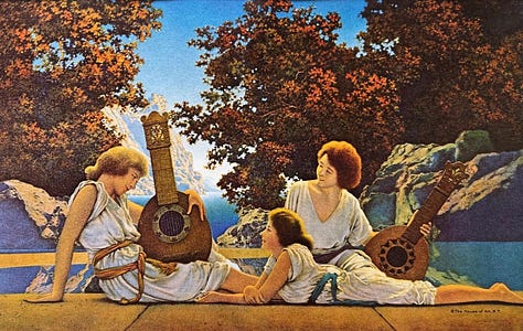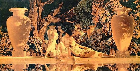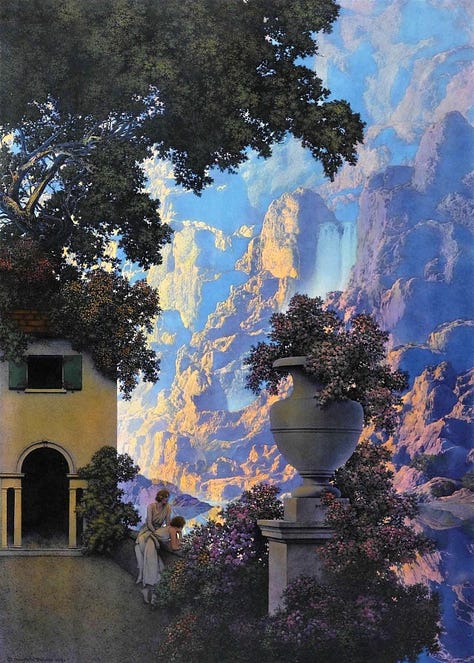 Maxfield Parrish created dream-like idyllic worlds. He often began with a photograph of a staged scene using family and friends.
