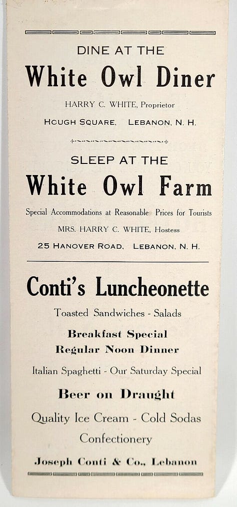 A vintage 1932 Worcester Lunch Car, it was purchased that year and re-christened The White Owl Diner in the early 1930s. It survived the 1964 Lebanon fire, before being demolished for the new bridge on Route 120 as part of the make-over of Hough Square in 1970.