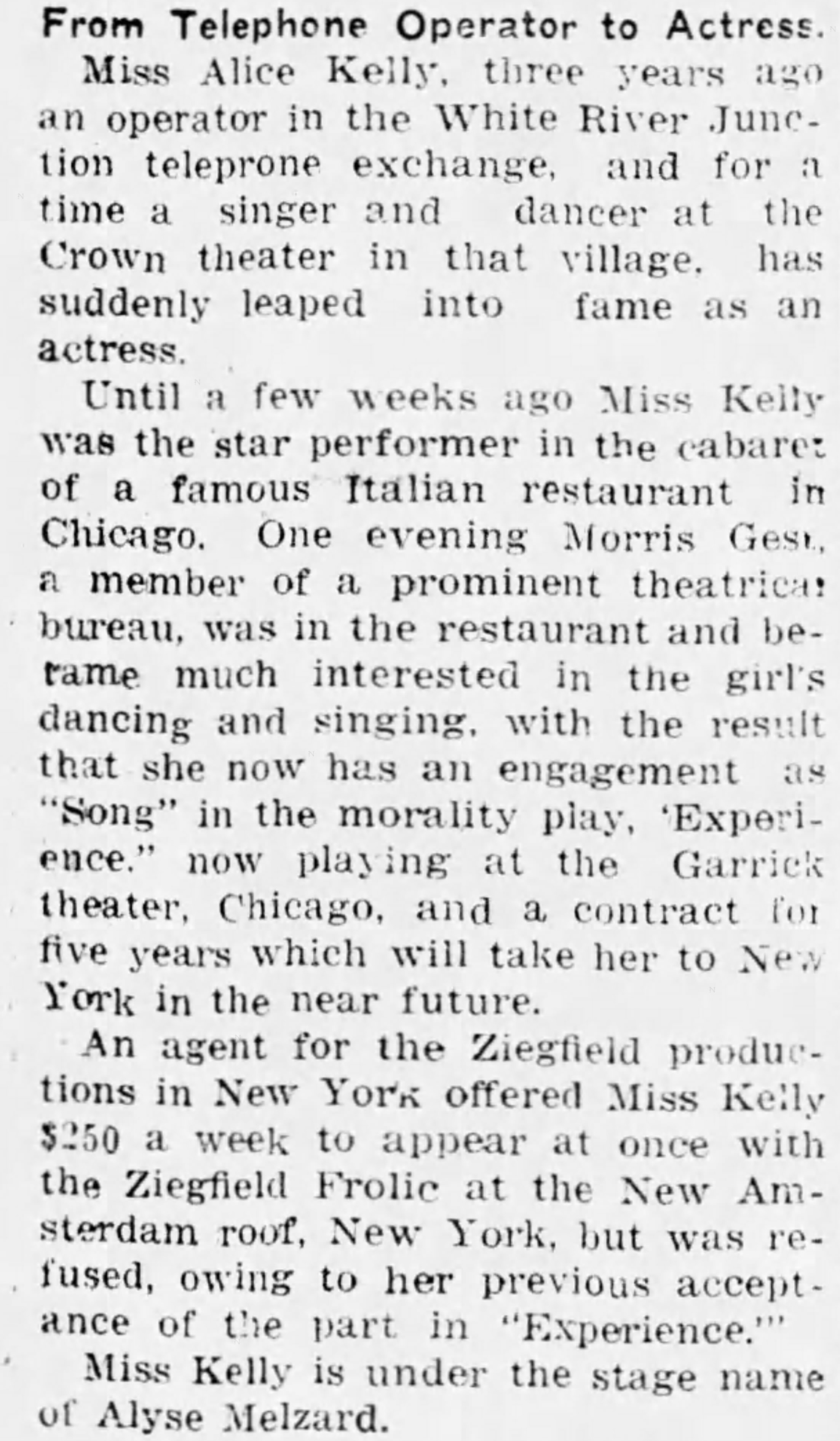 A charming 1916 clipping from the St. Albans Weekly Messenger recounts the rise of local Alice Kelly—from switchboard to stage, to a New York contract. The name change puzzles me, though