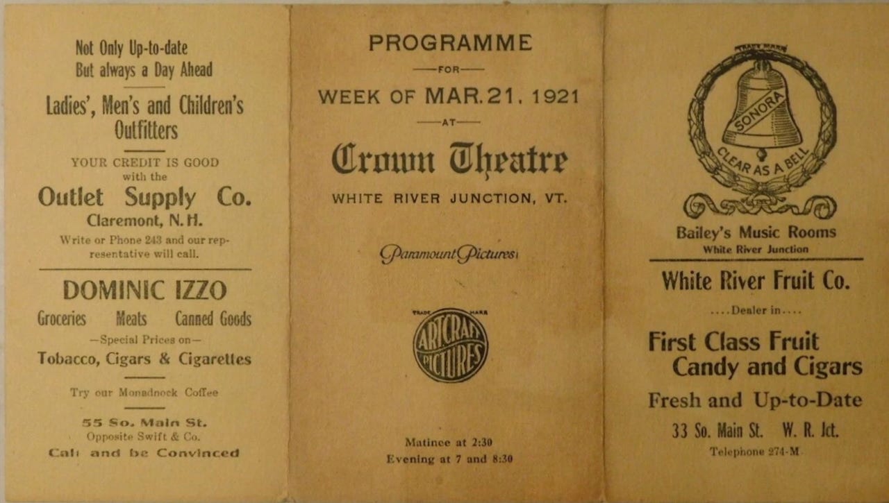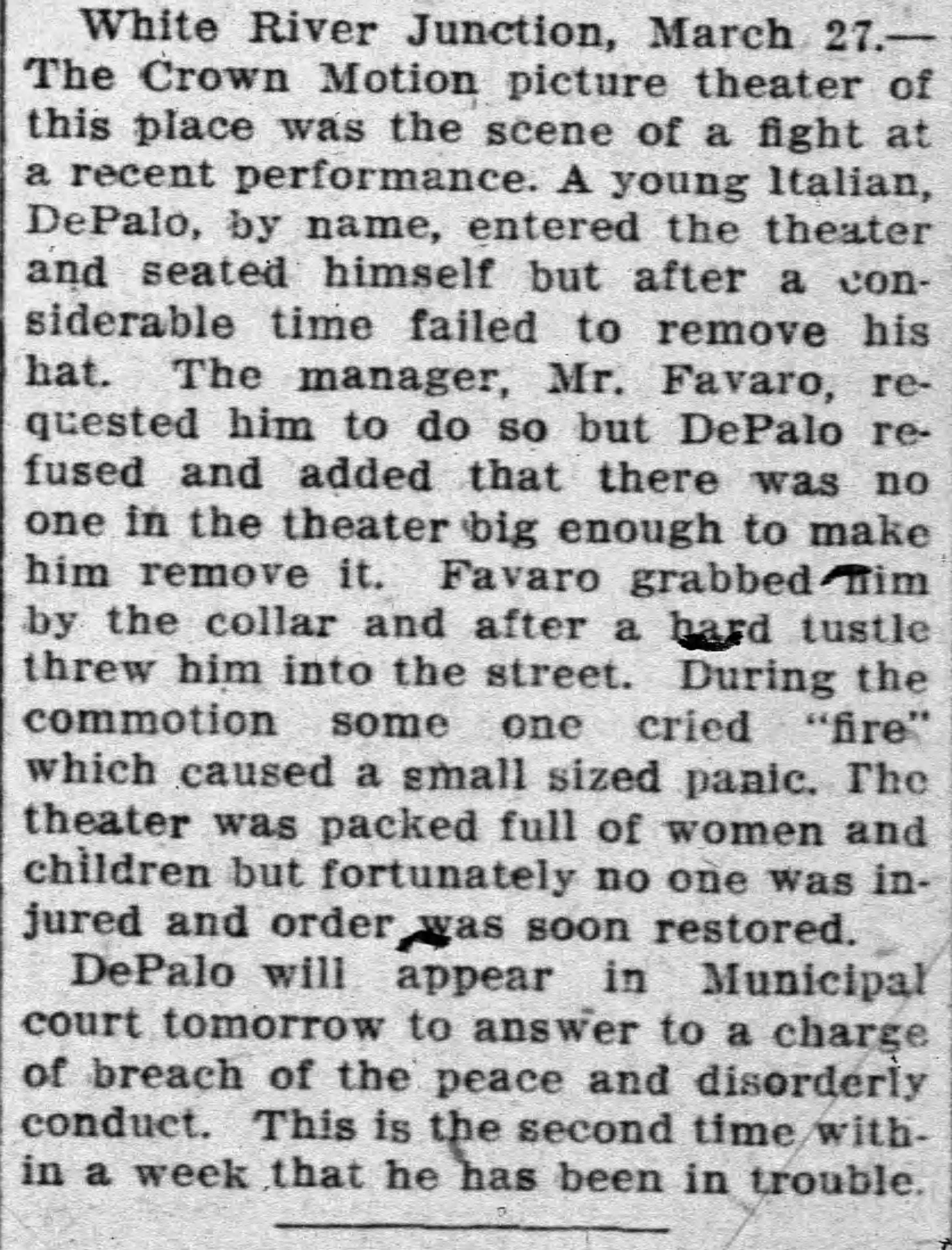 In 1917, a scuffle over a hat at the Crown Theater made the Rutland Daily Herald. The audience panicked when someone yelled “fire,” but all was quickly calmed—except for Mr. DePalo, who was back in court again that week.